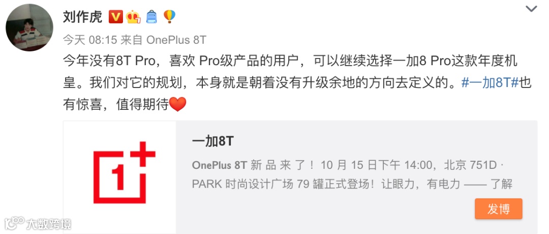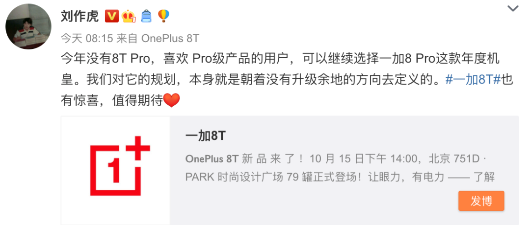 在今年上半年小白就搬运一加员工的消息跟大家说过了,下半年没有Pro,只是没想到一直有小伙伴不死心,今天一加手机创始人刘作虎也正式发声,表示没有一加8T Pro。