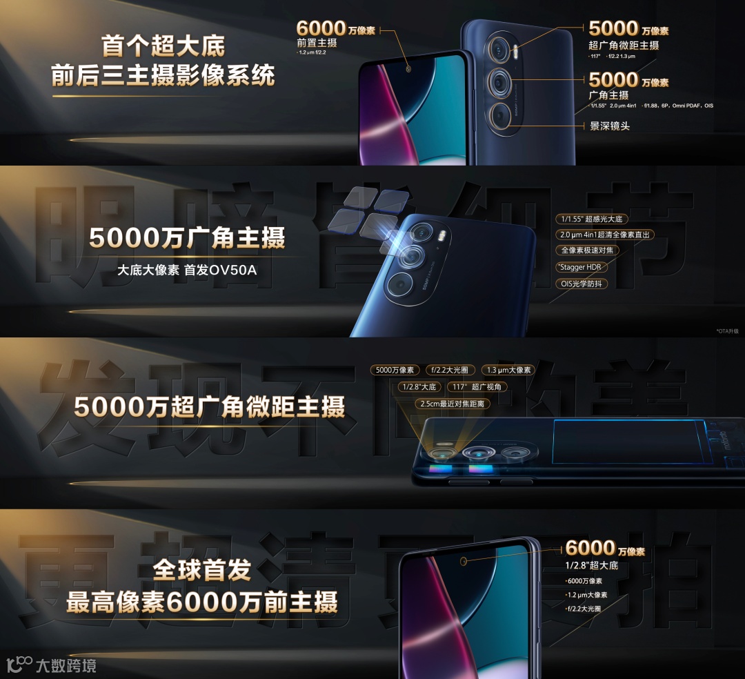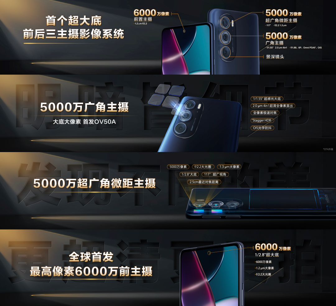 相机部分,moto edge X30前置60MP(全球首发OV60A传感器),这颗前置主摄镜头还支持拍照进行心率检测和血氧检测;后置三摄50MP主摄 (全球首发OV50A传感器 有ois)+50MP超广角(三星JN1)+2MP景深镜头(OV02B1B);