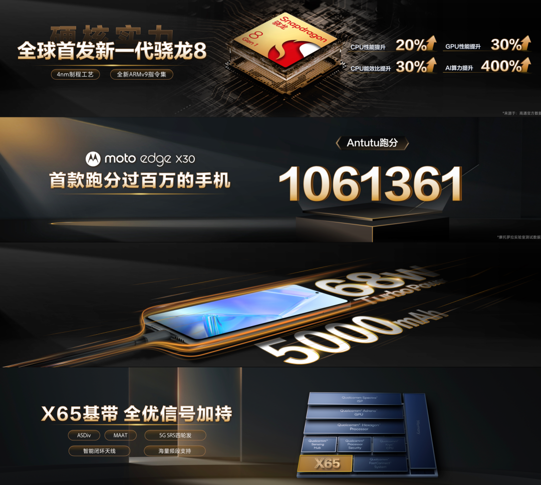 核心配置上,moto edge X30全球首发骁龙8 Gen1,集成X65 5G基带,支持双模5G(具体骁龙8规格戳蓝字回顾)Turbo LPDDR5+ Turbo UFS 3.1,5000mAh电池+68W有线充电,不支持无线充电;