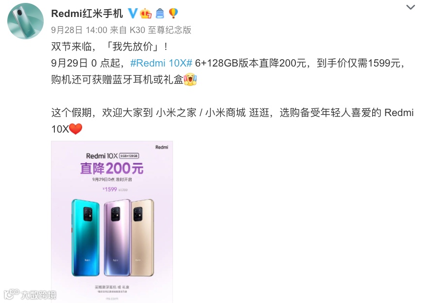 在9月份,卢伟冰曾陆陆续续先后宣布对旗下的Redmi 10X系列(Redmi 10X 5G版和Pro版2款)进行促销,但基本上都是一段时间降价几天,昨晚官方再度宣布放价,不清楚这次是否是永久降价。