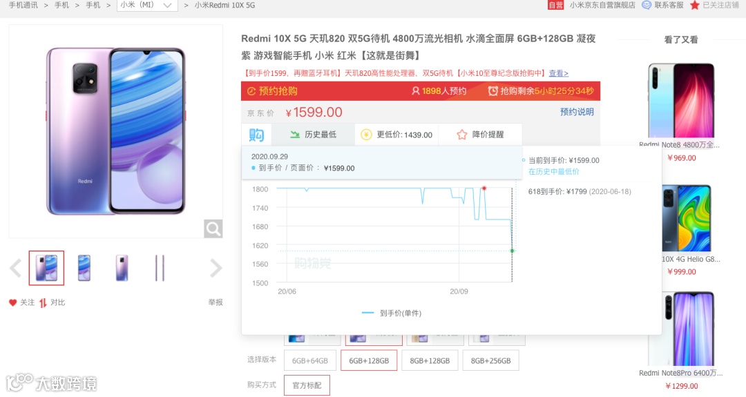 如上图所见,官方表示9月29日 0 点起,Redmi 10X 6+128GB版本直降200元,到手价仅需1599元,购机还可获赠蓝牙耳机或礼盒。小白看了下,发现这也是该版本的历史最低价。