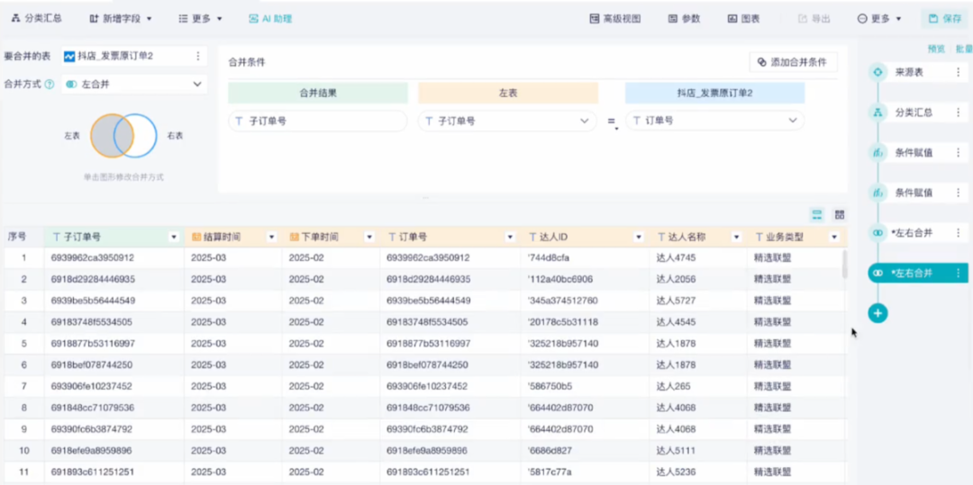 用九数云的数据“左右合并”功能,把发票、订单、达人三张表自动关联起来。