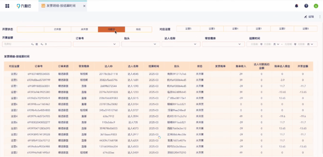 发票账单:含开票金额、开票日期、达人名称、费用类型等;