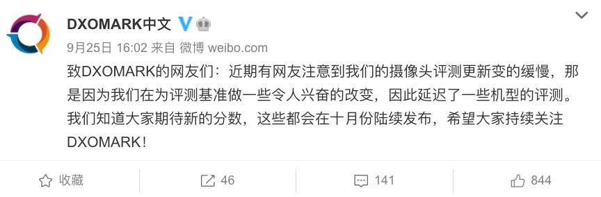 如上图所见,官博表示“有网友注意到DxOMark摄像头评测更新变的缓慢,那是因为我们在为评测基准做一些令人兴奋的改变,因此延迟了一些机型的评测。我们知道大家期待新的分数,这些都会在十月份陆续发布...”