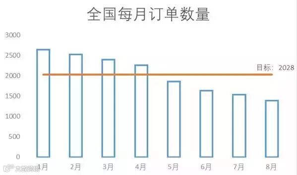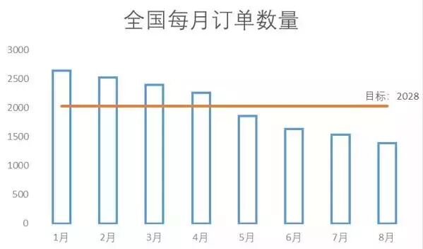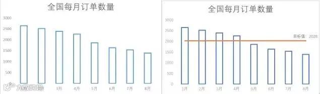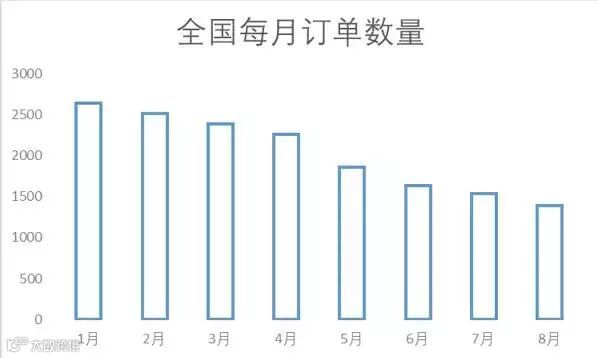 同一空间条件下,对不同时期数据的比较。如下图2018年1月到8月全国的订单数量柱状图,可以看出1月的订单量最高,8月最低。