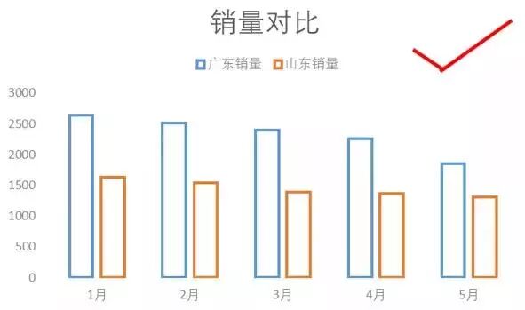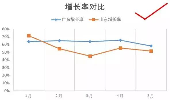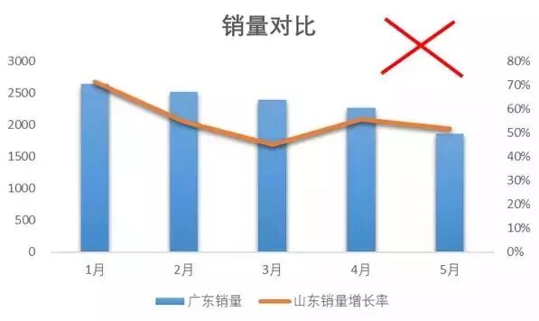 将广东与山东的销量进行对比,或将二者的增长率进行对比,若非要在一张图上放销量和增长率,那也应只放一个地区的销量和增长率。