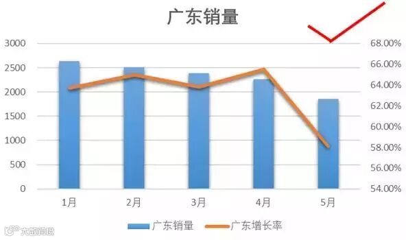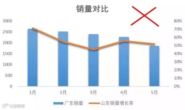 如下图所示,将广东的销量与山东的销量增长率进行对比,二者单位没有统一,这样对比显然是错误的。