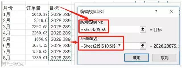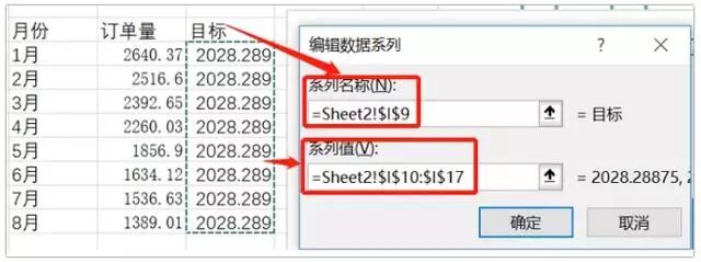 Step2:在绘图区右键【选择数据】——【添加】,系列名称为目标,系列值为刚新增的目标值一栏的数据值。