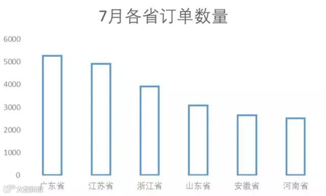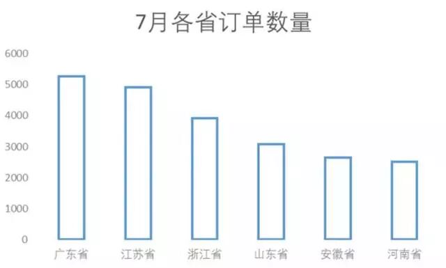 同一时间条件下,对不同空间数据的比较。如下图2018年7月各省的订单数量柱状图,反映的是不同省份间同一时期的比较。