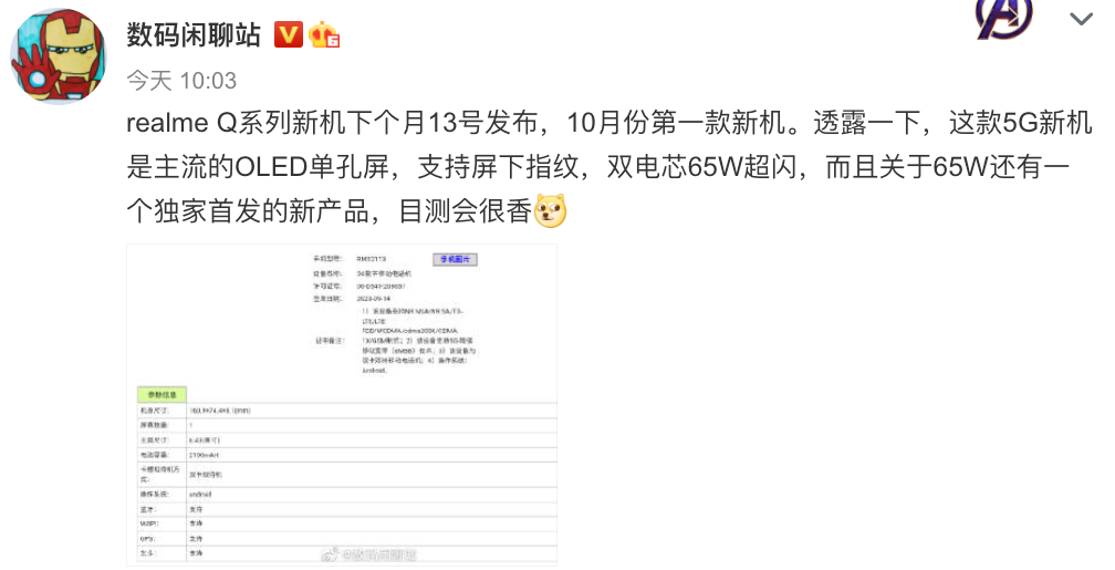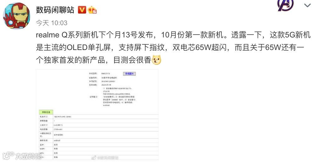 据爆料达人和realme员工互动来看,型号为RMX2173的新机对应的应该是realme Q2,其将于10月13日发布,定位是一千多块钱的65W双电芯5G手机。