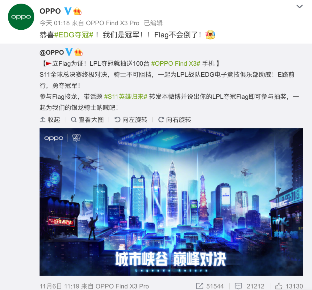 不少手机厂商也有送上祝贺,和英雄联盟有过合作的OPPO更是微博抽送100台Find X3手机,感兴趣的可以去参与一波~