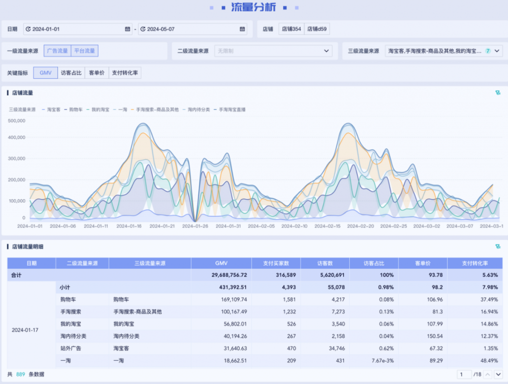 价值:帮助商家发现高投入低产出的投放入口,并及时优化。例如,如果直通车流量占比很高但转化率下降,就需要检查关键词匹配与落地页优化是否到位。