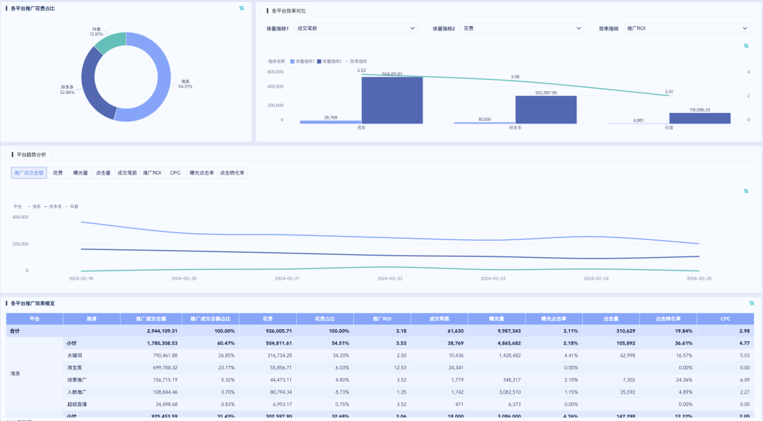 将天猫、京东、抖音等多平台数据打通,形成一个统一的分析看板