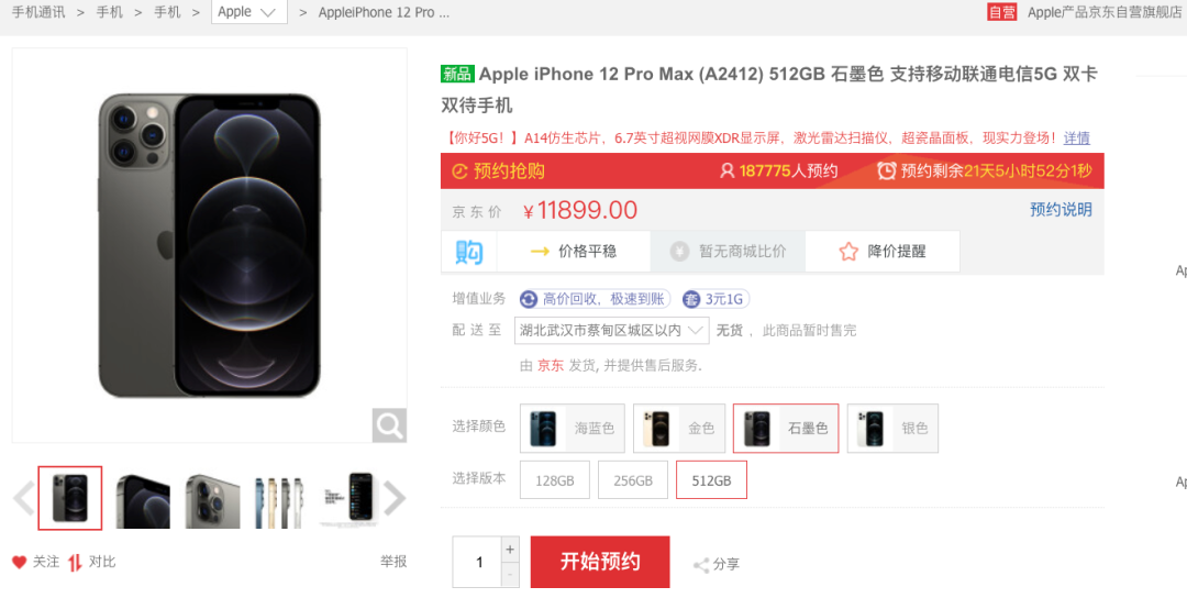 截止 10 月 15 日 16 点,iPhone 12 Pro Max 在京东自营预约人数:18.7万+。国行128GB 售价 9299 元, 256GB 售价10099 元,512GB 售价 11899 元,将于 11 月 6 日晚上 21 点开启预订,11 月 13 日正式开卖。