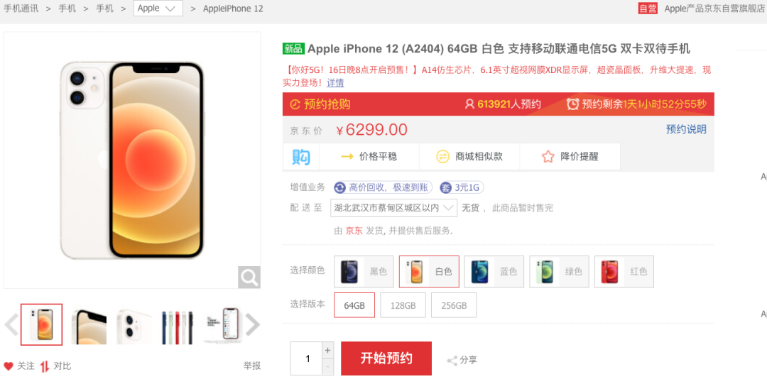截止 10 月 15 日 16 点,iPhone 12 在京东自营预约人数:61.2万+。64GB 售价 6299 元, 128GB 售价 6799 元,256GB 售价 7599 元,将于 10 月 16 日即明天晚上 20 点开启预订,10 月 23 日正式开卖。