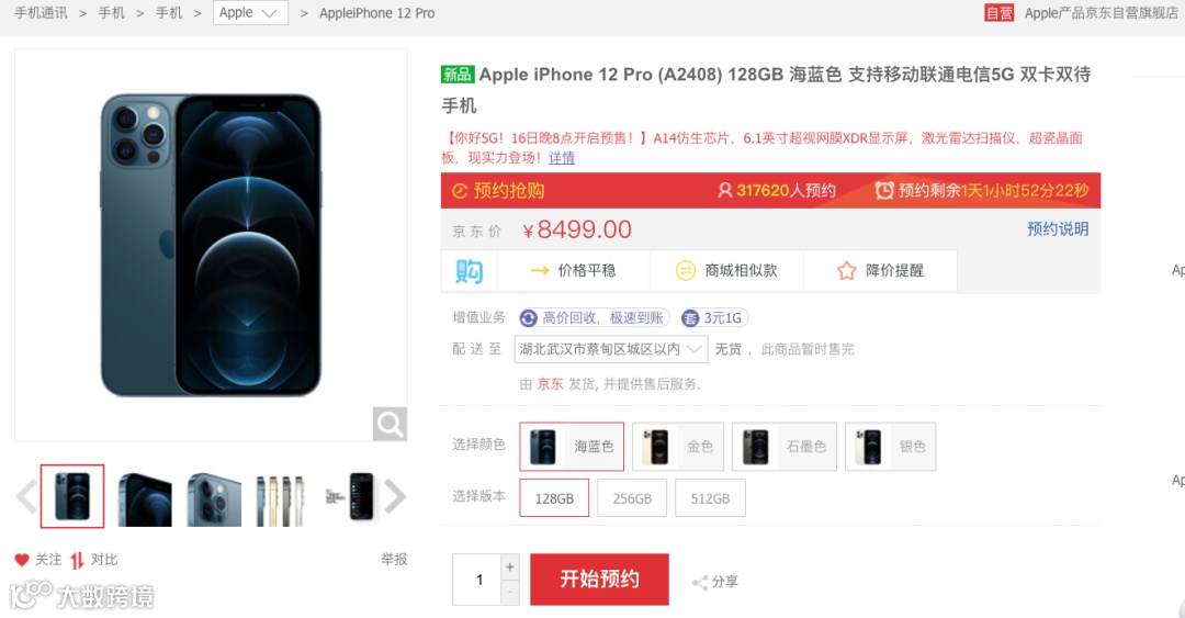 截止 10 月 15 日 16 点,iPhone 12 Pro 在京东自营预约人数:31.7万+。128GB 售价 8499 元, 256GB 售价 9299 元,512GB 售价 11099 元,将于 10 月 16 日即明天晚上 20 点开启预订,10 月 23 日正式开卖。