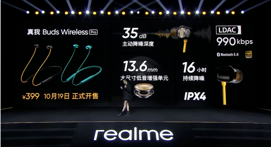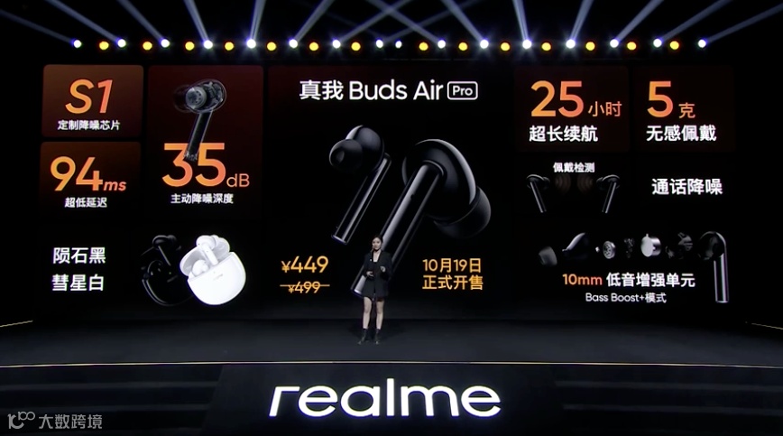 ①realme Buds Air Pro 真无线降噪耳机:售价499元,首发449元,10月19日正式开售。其提供彗星白、陨石黑2个配色,IPX4 防水,支持蓝牙 5.0 ,搭配充电盒可实现长达 25 小时的续航时间,Type-C 充电口,充电 10 分钟听歌 3 小时。