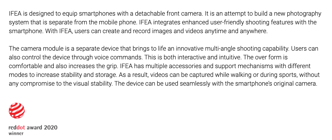 IFEA 分离式镜头设计还配备了 IFEA 磁吸式专用云台,同时支持为镜头充电;专用移动电源,充电同时也可作为支架使用,并配有防水保护套;便携式磁吸领夹设计,适用多种场合,可随时随地佩戴;语音可实现全程操控,解放双手带来全新拍摄体验。