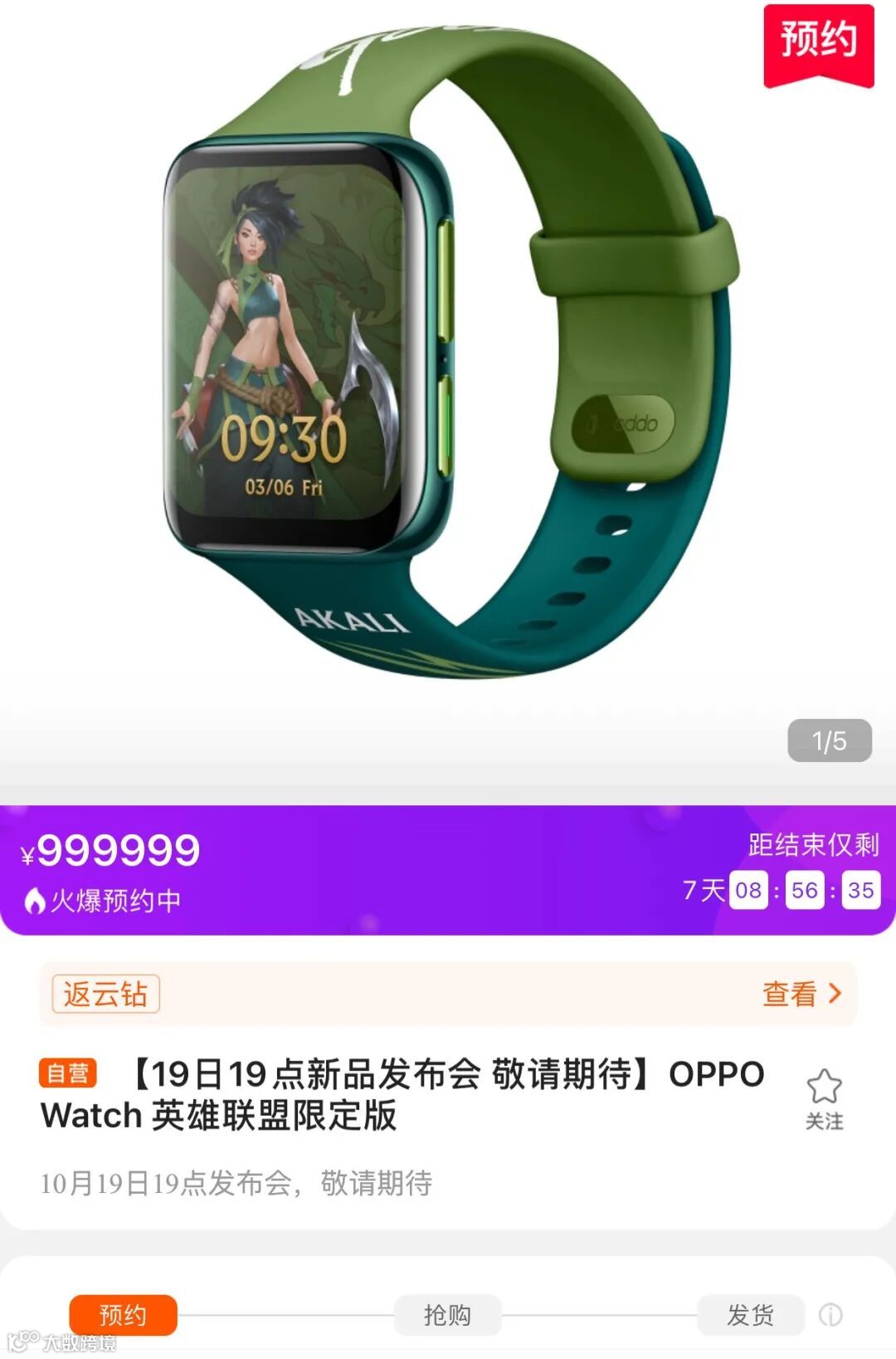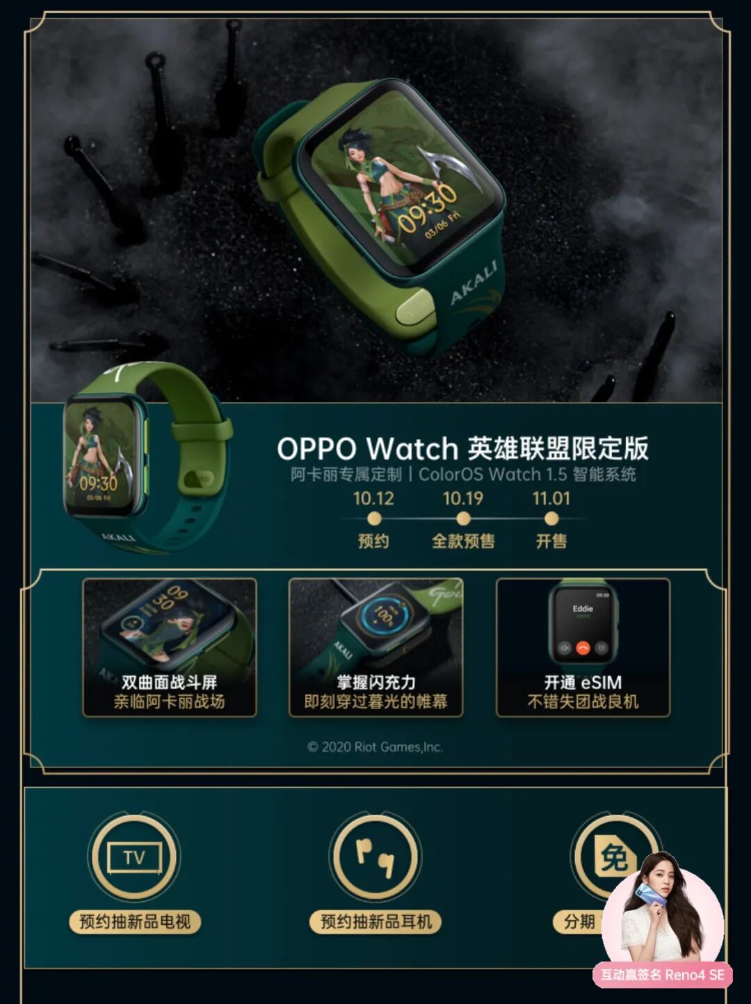 另外是 OPPO Watch 英雄联盟限定版,主要以 阿卡丽 为定制元素,其同样是 10 月 19 日晚上 19 点发布,目前正在预约中,但预约界面有公布开卖时间:11月 1 日。