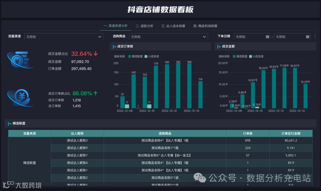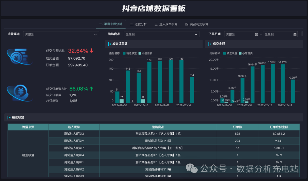 重点关注指标:成交金额、成交单数、退款金额、退款单数、商品成交趋势、订单来源