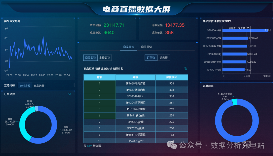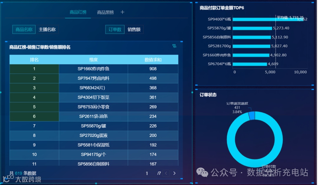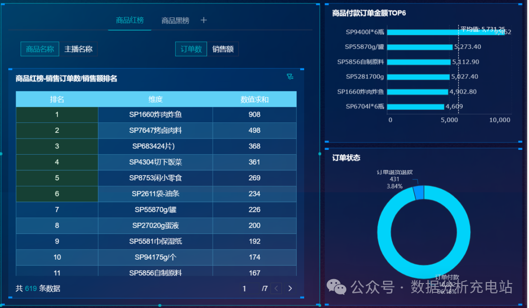 重点关注指标:商品红榜、商品黑榜、商品付款订单金额TOP6、订单状态
