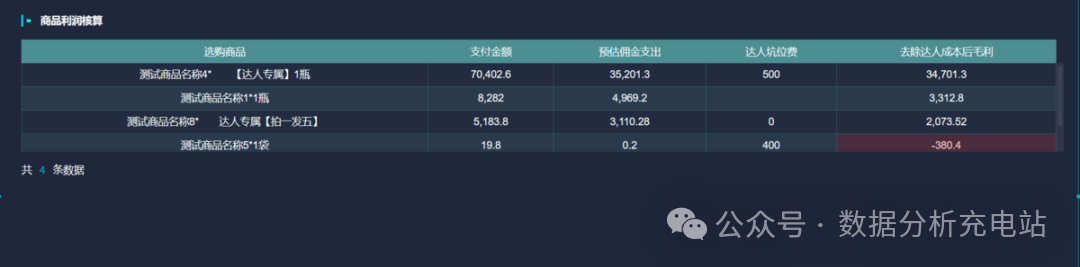 明细表里可以看出“达人2”和“达人8”去除成本后牟利为负,可以考虑是否继续合作,重新寻找更合适的达人。