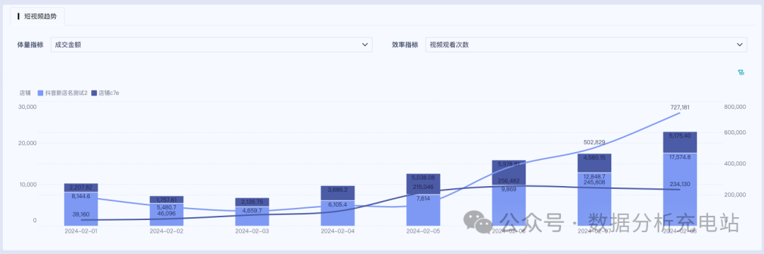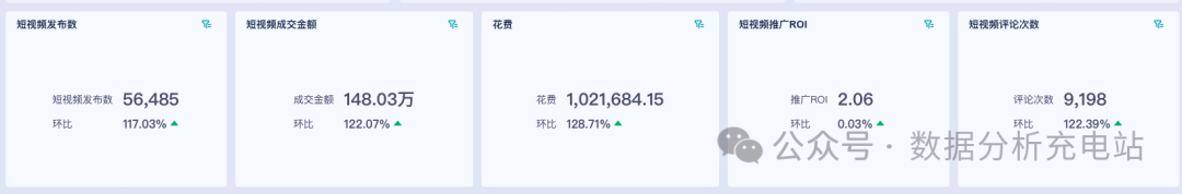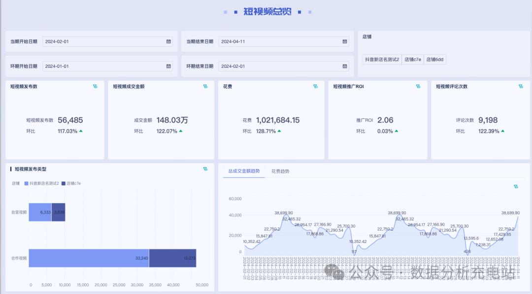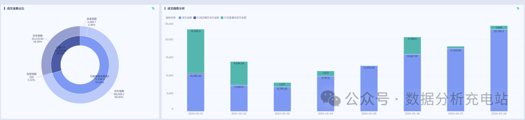 成交金额占比:可以以饼图的形式可视化,根据店铺,汇总不同类型的视频的成交金额情况,帮助企业定位高效的视频形式,结合店铺特性优化内容策略。