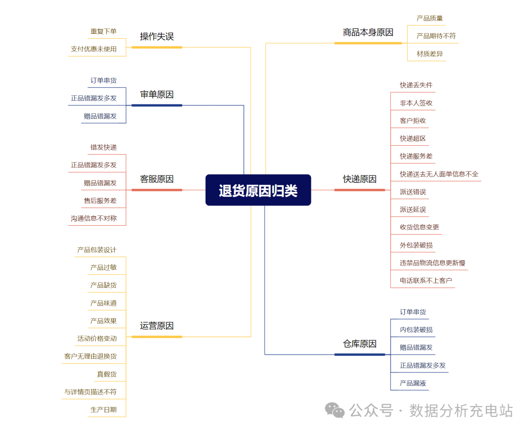 退货原因是反映客户行为和商品问题的关键,将退货原因进行划分,可以责任明确到人;分析不同退货原因的占比,并进一步细分为: