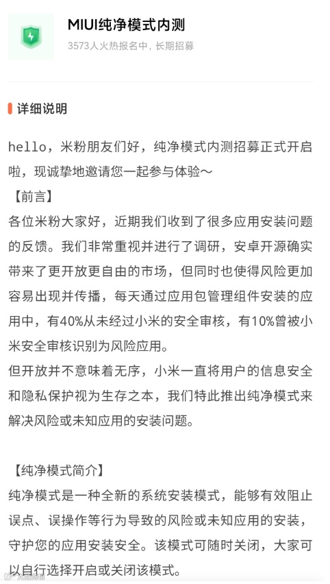 官方介绍称,MIUI纯净模式是一种全新的系统安装模式,能够有效阻止误点、误操作等行为导致的风险或未知应用的安装,守护用户的应用安装安全,而且它还支持用户自选选择开启或关闭。9月6日开始,每天将通过申请并发放1000个内测名额。感兴趣的小伙伴可以去关注下。