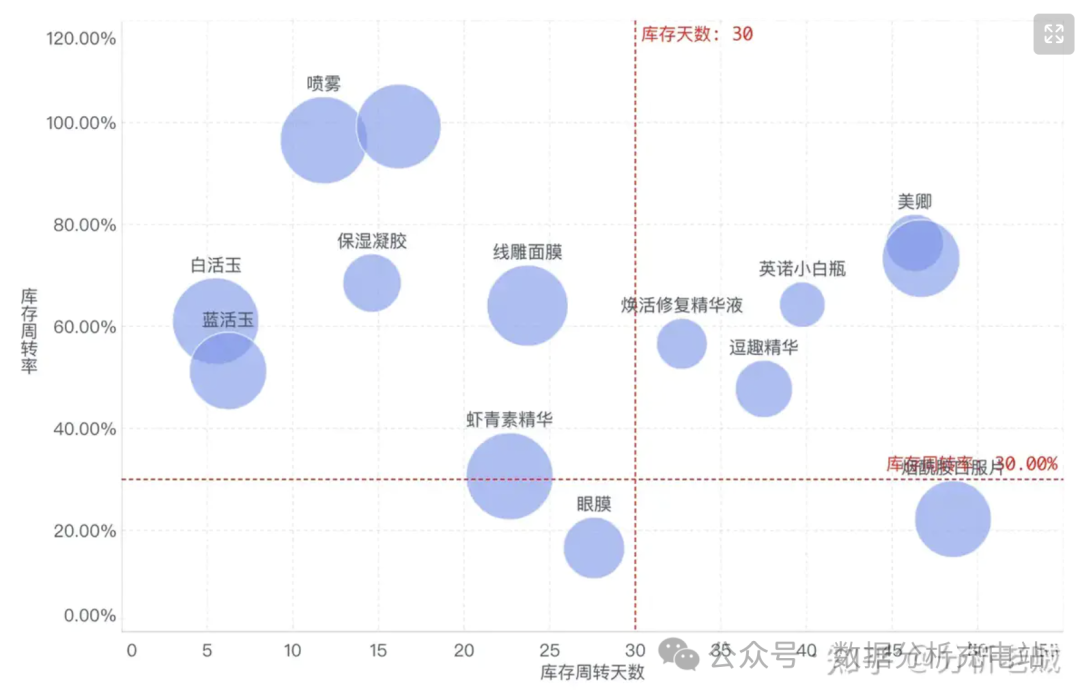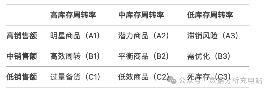 如上图,横轴为库存周转率(或库存天数),反映商品销售速度;纵轴为销售额占比(或毛利润贡献),反映商品对业务的贡献度。不同企业可能根据需求调整维度,例如用“缺货风险”或“保质期”作为坐标。