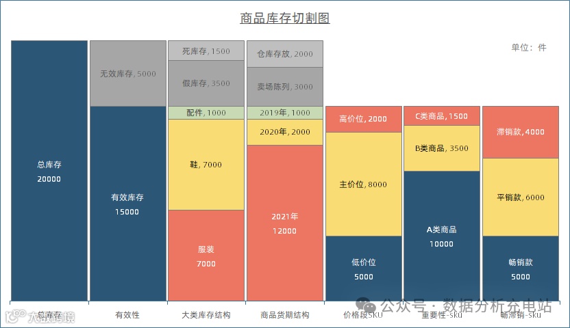 上图为黄成明老师在《数据化管理》一书中介绍的商品库存切割图,包括库存总量、库存结构和SKU三部分库存的切割,把库存结构展示得非常清楚!