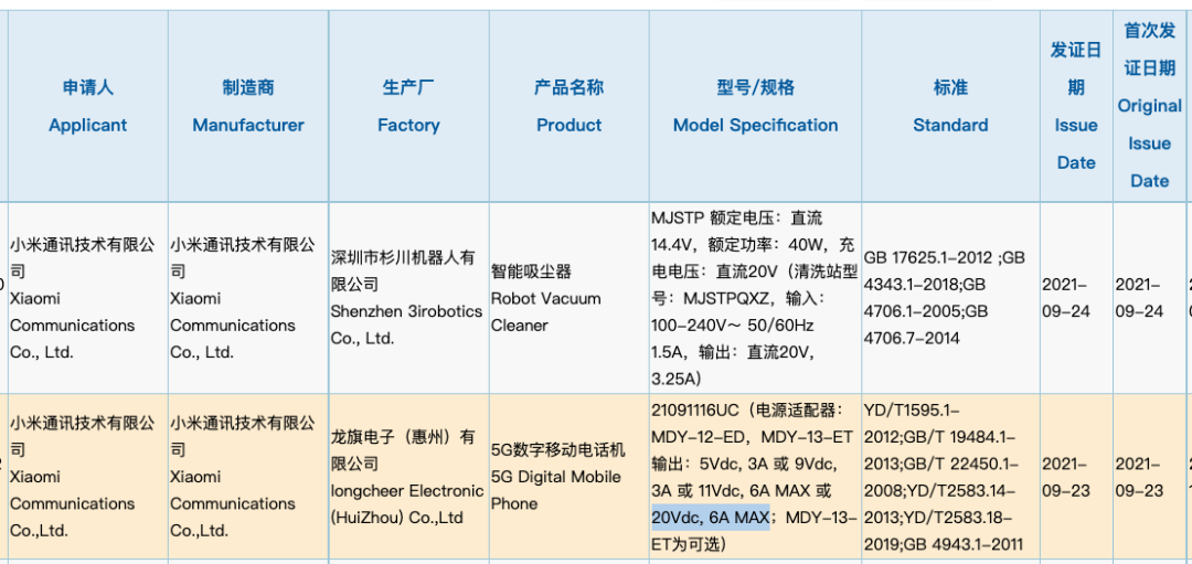 小米型号为21091116UC的5G新机于近日获得3C认证,配备最高20V/6A 也就是120W有线快充。