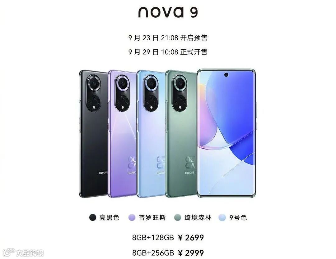 nova 9 Pro(不含耳机、有快充套装):8+128GB售价3499元,8+256GB售价3899元。目前已经开启预售,将于9月29日上午10:08正式开售。