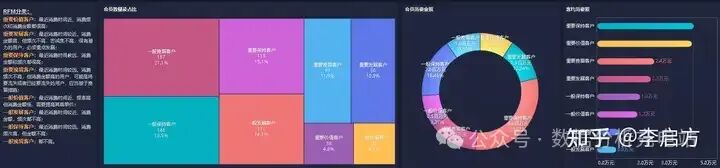 通过矩形树图展示RFM各分类下用户数量及占比,饼图展示各类下销售额及占比,柱状图展示各类客均消费额排行。