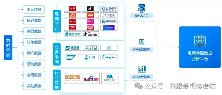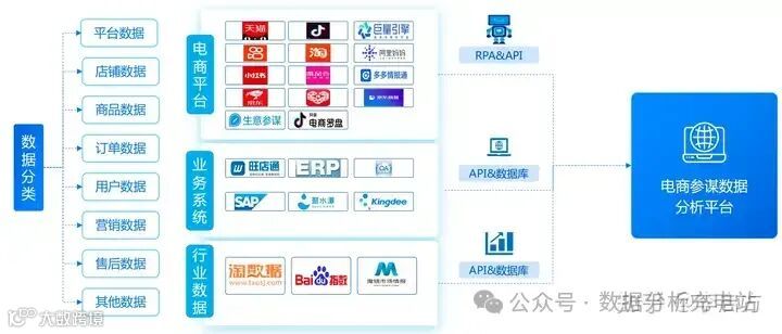 数据、魔镜市场情报等,业务系统的数据像旺店通、ERP、OA等,当然还要各大电商渠道的数据像淘宝、抖音、京东等。平时的做法就是人工下载,找个运营花半天时间专门去各个平台下载数据,再进行分析整理