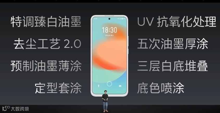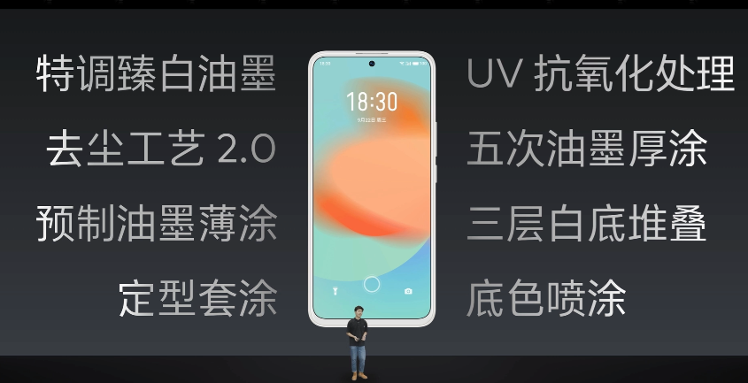 禅配色也是魅族18X最特殊的配色,同时拥有白色前面板、白色中框、白色后盖,真·纯白一体机身,不过由于工艺难度,量产时间也比其他两个配色版本要稍晚一点。