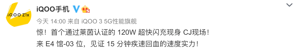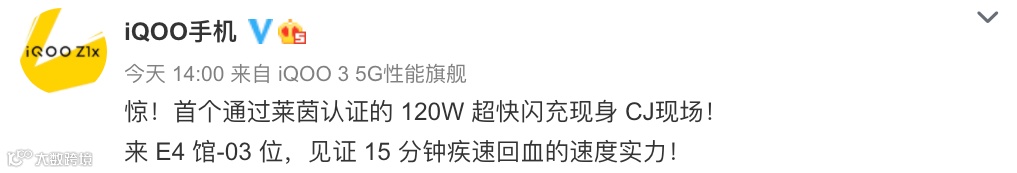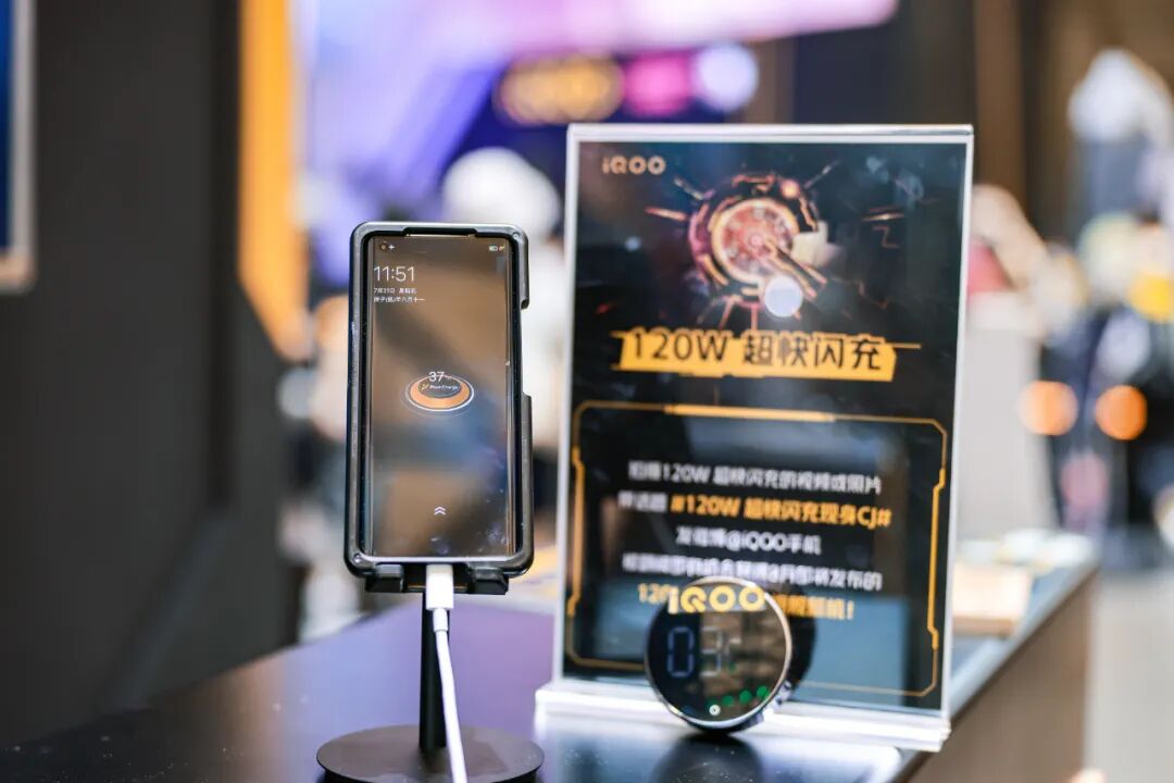 vivo旗下的iQOO在CJ展上现场演示了新旗舰120W超快闪充,大概15分钟可以充满,值得注意的是其演示用的机子带有保密壳,其应该就是将于8月发布的iQOO 3 Pro,左上角单挖孔曲面屏。官方还表示iQOO新机是首台通过德国莱茵安全快充认证的120W快充手机。