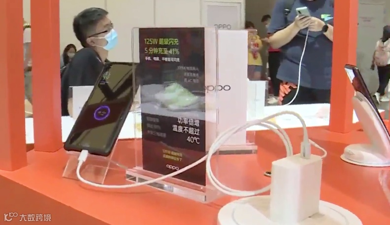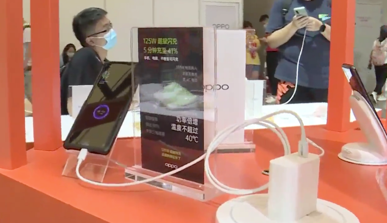 OPPO这边上午先是展出了125W超级闪充的工程机、适配线、充电头等等,演示了充电速度,还展出了便携、超小体积的50W超闪饼干充电器,下午主要是ColorOS游戏内容,现场产品经理邀请观众和职业选手李晓峰比拼手速。