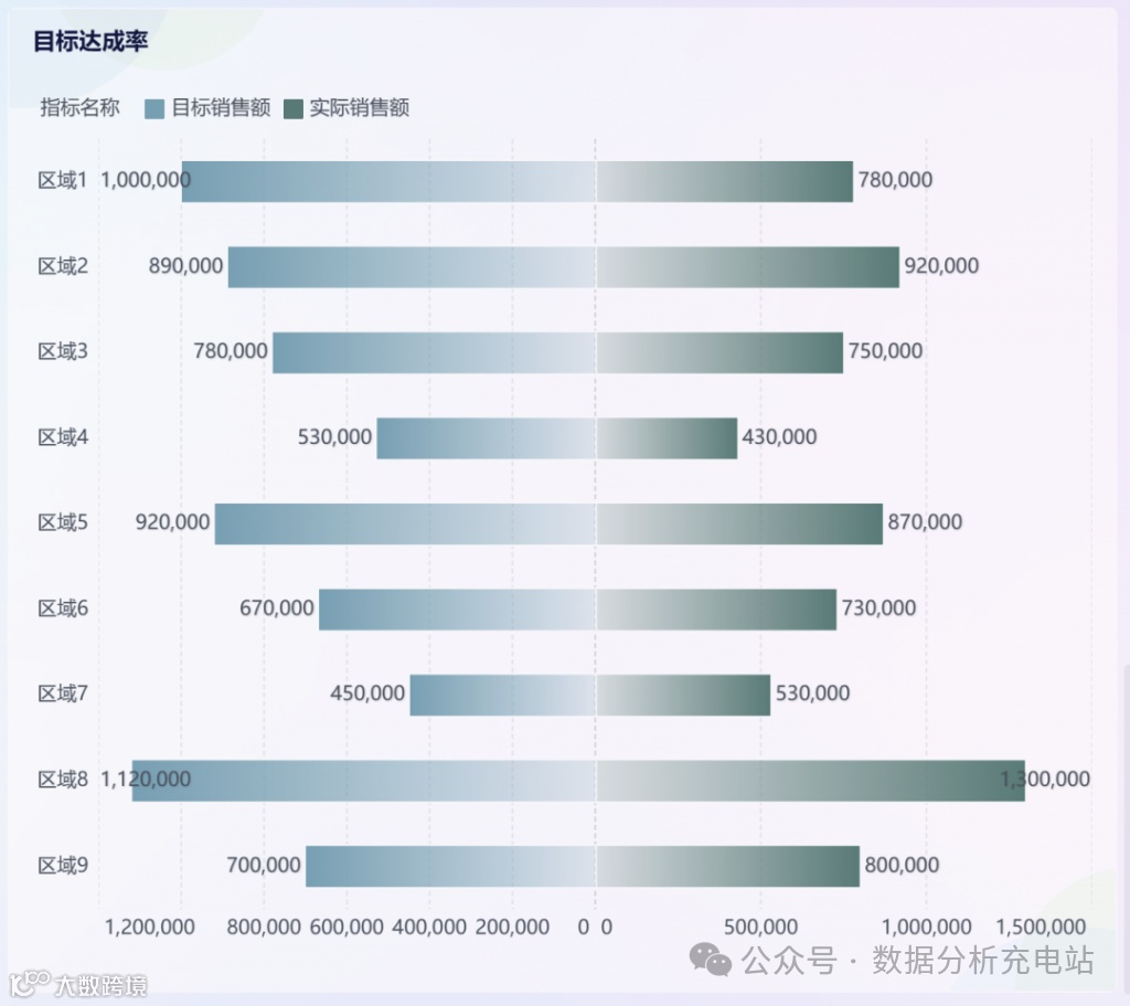 区域2,6,7,8和9完成了各自的目标额度,其他几个区域可以根据实际情况调整后续的目标销售额,排查销售中出现的问题。