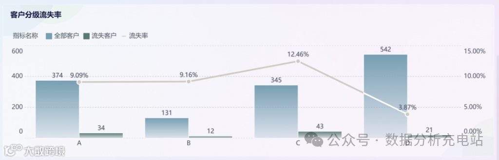 本销售模板展示了客户分级流失情况,其中C类客户流失率最高,达12.46%,这是一部分潜在需求客户群体,流失率高说明对C类客户的需求挖掘率尚不足,后续需要利用产品优势及客户需求,有针对地刺激客户消费。