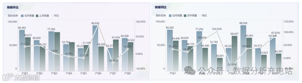 从上图来看,产品6的本月销量居各大产品类别之首,结合销量环比情况,它较上月销量也增幅度最大;产品1的本月和上月销量都较稳定地居于前列;而产品5的销量则持续较低。