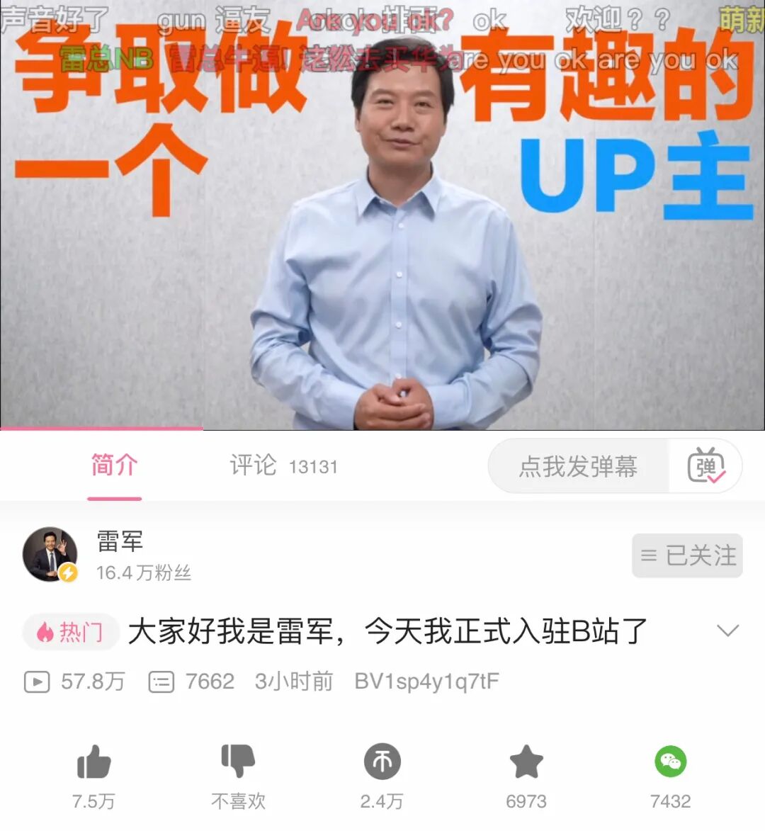 发布的第一条投稿视频播放量也是杠杠的,弹幕也被雷总经典的Are you OK刷屏。