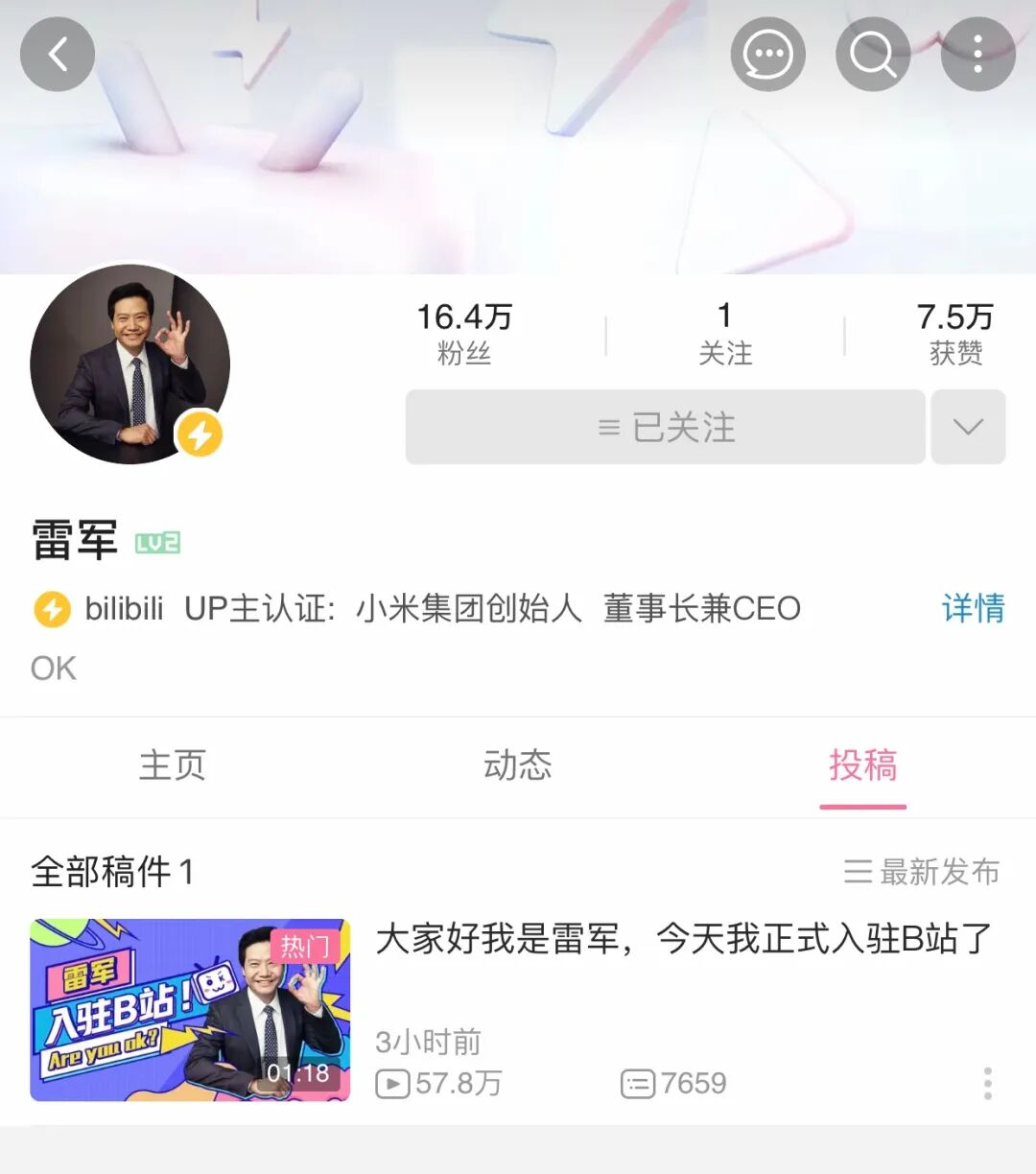 另外就是刚入驻B站不久的雷总了,不到2天,雷总的粉丝已经从几千到了将近20万,等级也从L1变成了LV2。