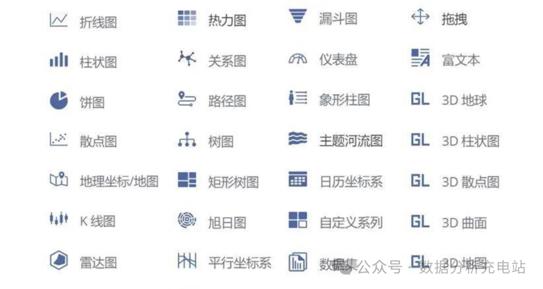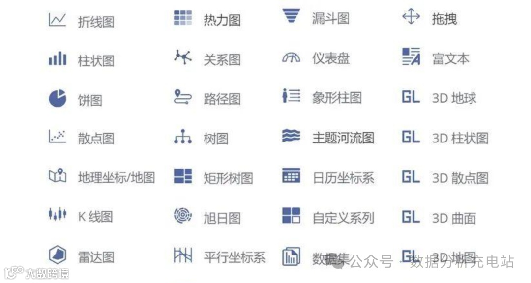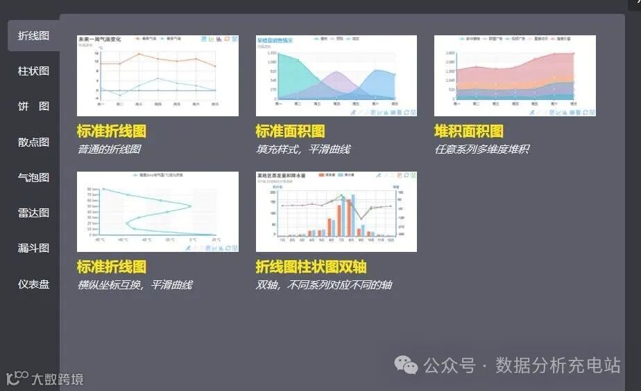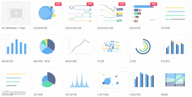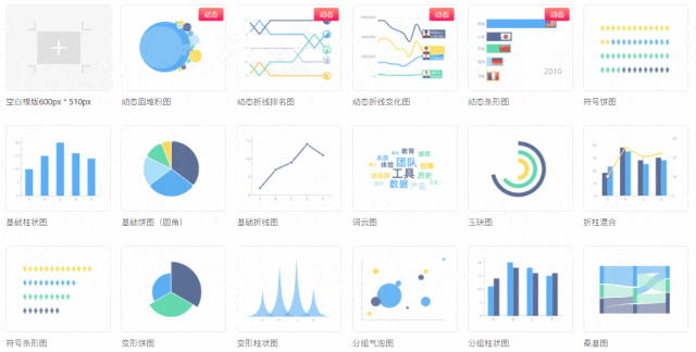图表类型:可视化图表类型全面又丰富,图表类型将近100种。包括饼图、线形图、柱状图、混合图、面积图、散点图、极坐标图、关系图、仪表盘、树图、桑基图、漏斗图、热力图、地图、水波图等。