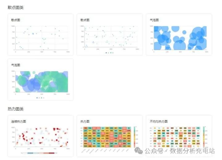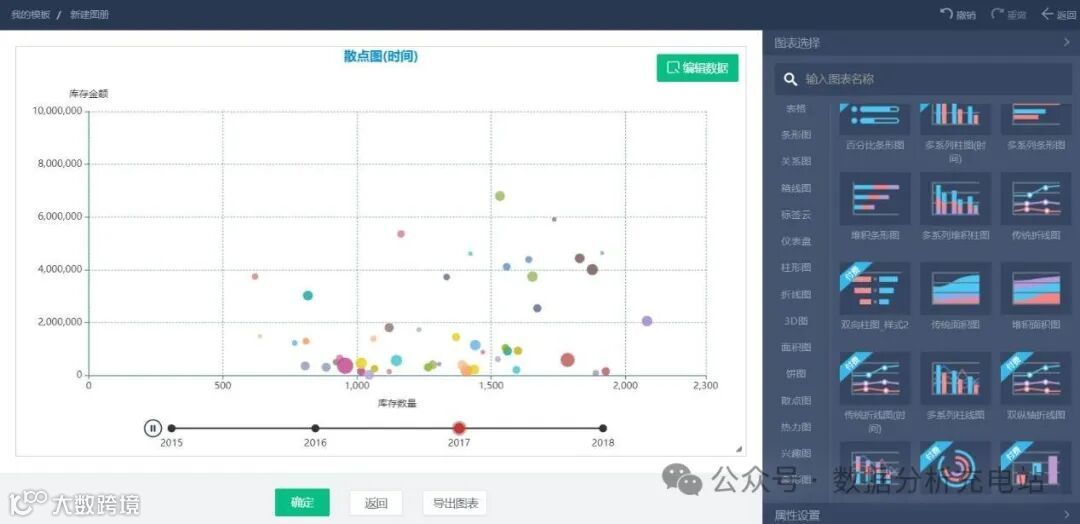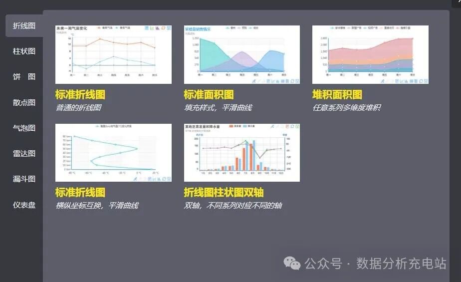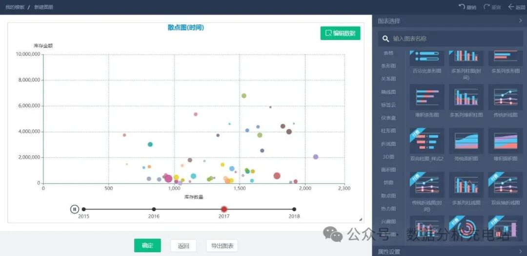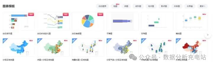 图表类型:图表模板类型全、数量多,包括折线图、阶梯图、柱状图、瀑布图、直方图、条形图、饼图、热力图、气泡图、散点图等。