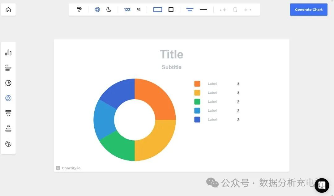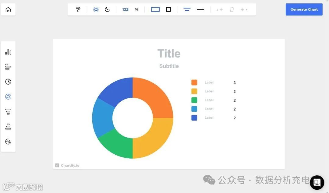 介绍:Chartify是一个线上图表制作工具,适用于论文图表创作。甚至不需要注册登录,就能立刻开始设计自己需要的图表样式。所有的功能都在工具栏,在左方图表列,可以选择不同的图表样式,在上方工具列,可以调整背景黑白、数字还是百分比、横式还是正方形,以及要删掉哪一的区块,或是新增哪一个区块。