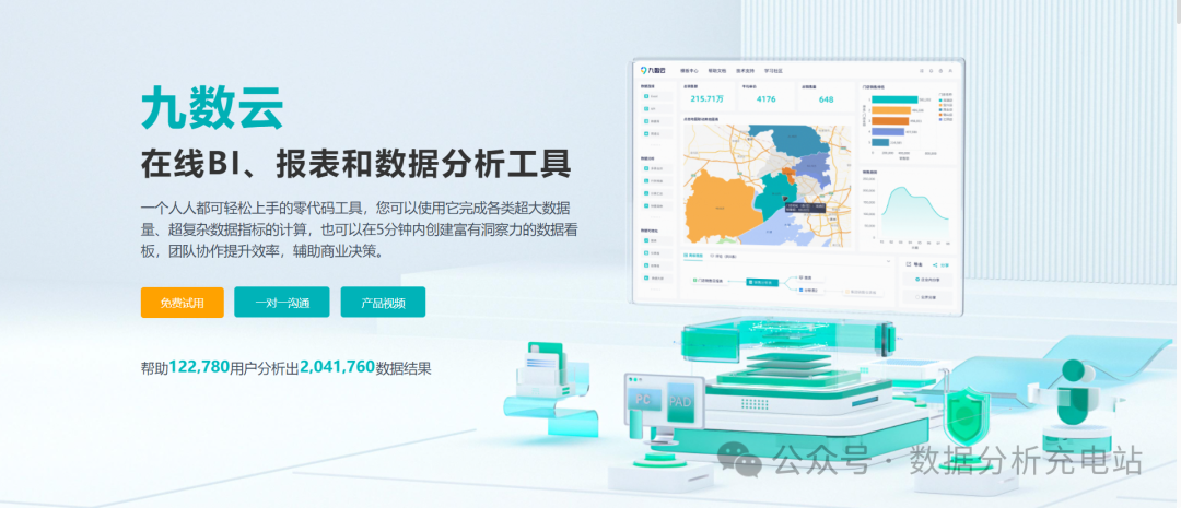 介绍:九数云是帆软打造的一款在线BI、数据分析和图表制作软件,可以连接excel、飞书文档、简道云表单和各类数据库,零代码分析千万级别的数据并制作各类美观图表,功能强悍的数据可视化工具网站,必须推荐!!