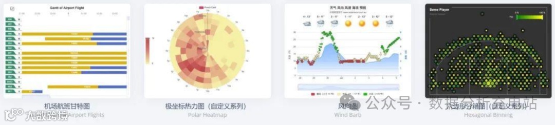 图表类型:Echarts几乎提供了常规能用到的所有图表形式,不仅有常规的统计图表,还有炫酷的3D可视化,而且对国内开发环境非常友好。