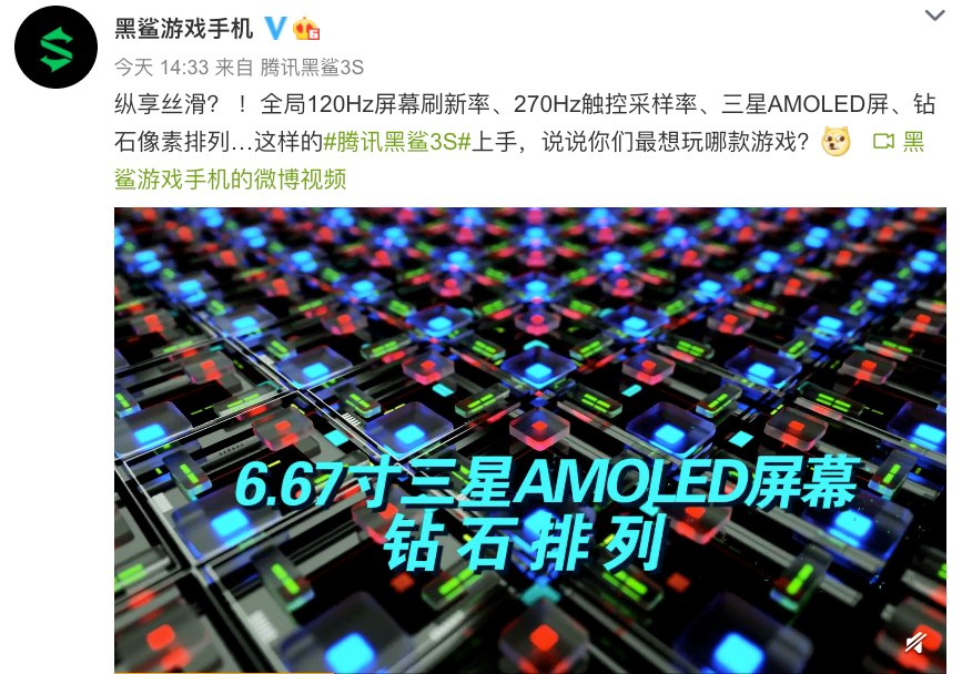 配置上,官方预热 黑鲨3S 全局120Hz屏幕刷新率、270Hz触控采样率、三星AMOLED屏、钻石像素排列。 作为补充,拯救者Pro是维信诺屏,ROG 3是天马屏。不过黑鲨3S的屏幕分辨率尚未揭晓,就其命名来看这次黑鲨3S只有一款,似乎像是黑鲨3的接班者,而大屏2K的黑鲨3 Pro并未迭代更新。