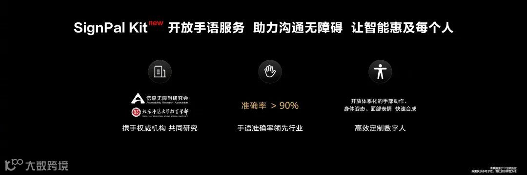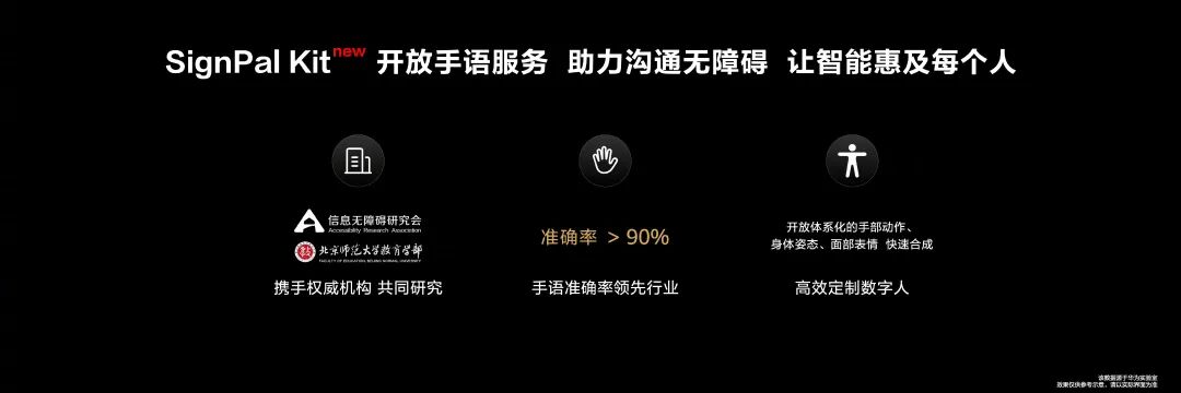 大会过程中还全程有一个手语同传,官方表示这是华为首个AI手语小姐姐,通过数字人进行手语同传直播(大会全程屏幕一角里一直在飞快比划手语),并表示SignPal Kit开放手语服务,融合手语语言学专家知识,实现连贯、自然的手语身体姿态,手语准确率超过90%,让沟通无障碍。